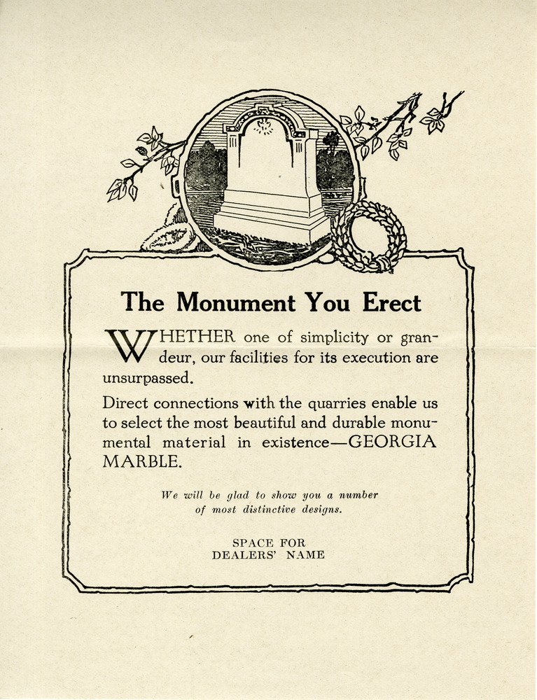 Georgia Marble advertisement template, "The Monument You Erect," Georgia Marble Company Records, 1910-2004, SC/G/006, Box 25, Kennesaw State University Archives.