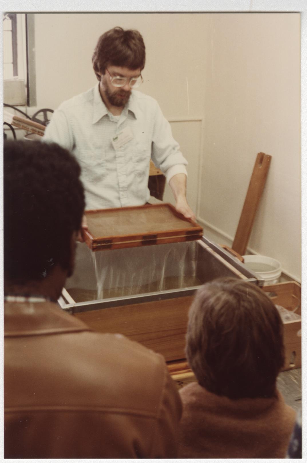This photo was most likely taken at the 1982 SGC International Conference in Tulsa, Oklahoma. A man seems to be demonstrating the art of papermaking.