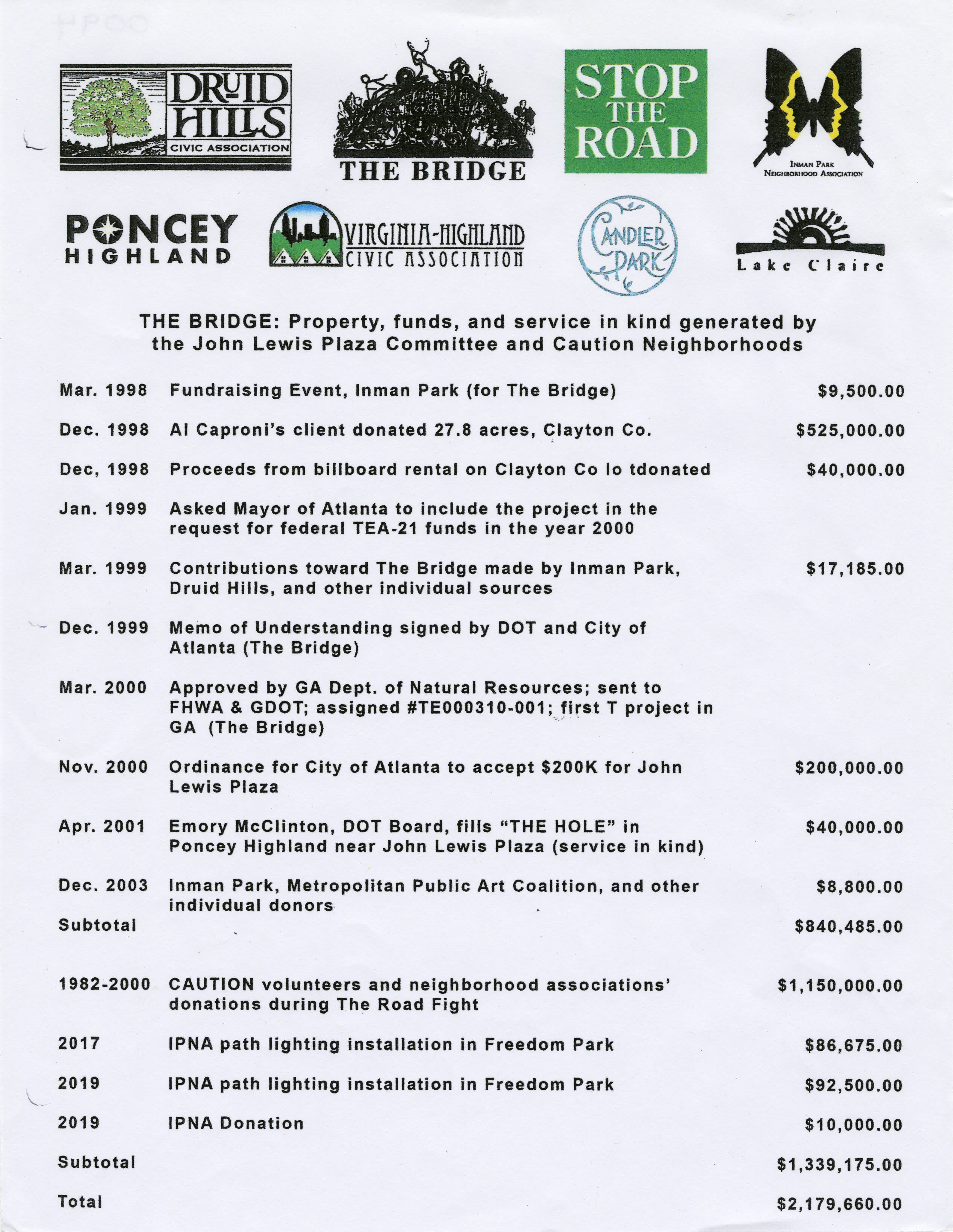 The Bridge: Property, funds, and service in kind generated by the John Lewis Plaza Committee and CAUTION Neighborhoods (used for fundraising)