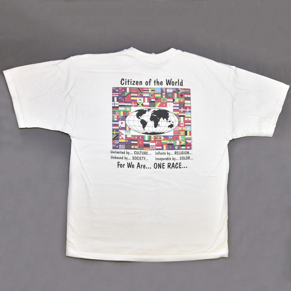 T-shirt for International Festival 2003. Front of shirt features planet logo with the words "International Student Association/International Festival 2003/ Kennesaw State University." Back of shirt features flag and globe logo with the words "Citizen of the World/ Unlimited by... Culture... Infinite by... Religion.../ Unbound by... Society... Inseparable by... Color.../For We Are... One Race..."