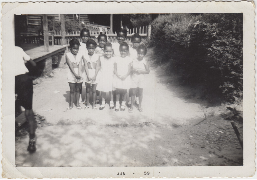 Unidentified child, Beverly Griffin Patton, Phyllis Hill, Bobbi Rice, Brenda Henderson, twins Marilyn Johnson Callahan and Carolyn Johnson, Pam Henderson, Deborah Sue Griffin, and Vicky Johnson, Moon Street, Acworth, Georgia, June 1959, Historic Black Acworth Image Collection, 2020, Patton, Kennesaw State University