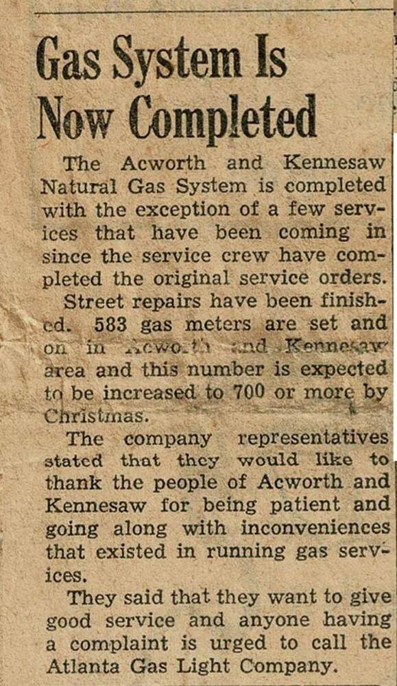 "Gas System is Now Completed," newspaper article in the Acworth Progress, 1957, Save Acworth History Foundation collection, SC/A/003, Kennesaw State University Archives.