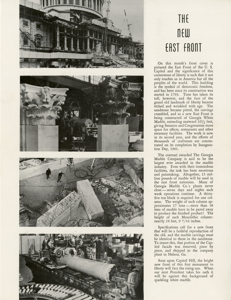 Document containing images of and information on the renovation of the East Front of the United States Capitol building by the Georgia Marble Compnay. The contract was awarded in 1958, and Georgia Marble Company completed the work, which included 15 million pounds of marble, in May 1960.