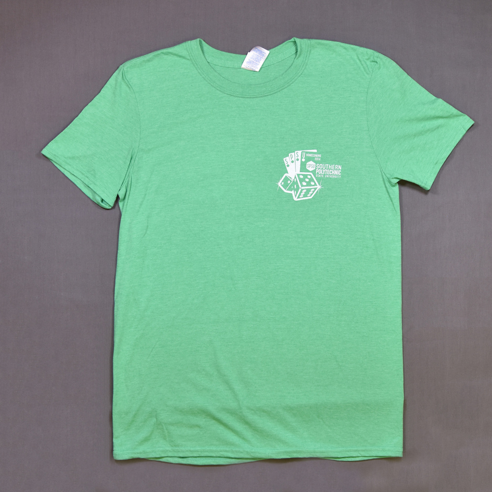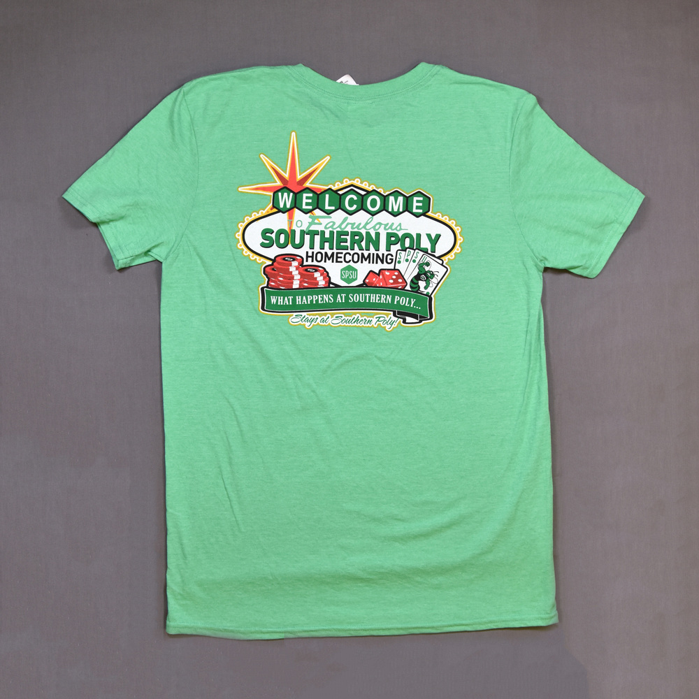 T-shirt for SPSU Homecoming. Front of shirt features SPSU logos and an illustration of playing cards and dice. Back of shirt says "Welcome to Southern Poly Homecoming/ What happens at Southern Poly/ Stays at Southern Poly." over an illustration of poker chips, dice, and playing cards.