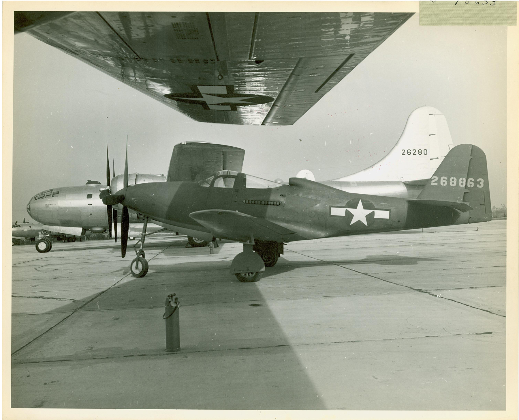 Profile view of P-63 Kingcobra next to a B-29 bomber on the test apron, taken from underneath the wing of a B-29