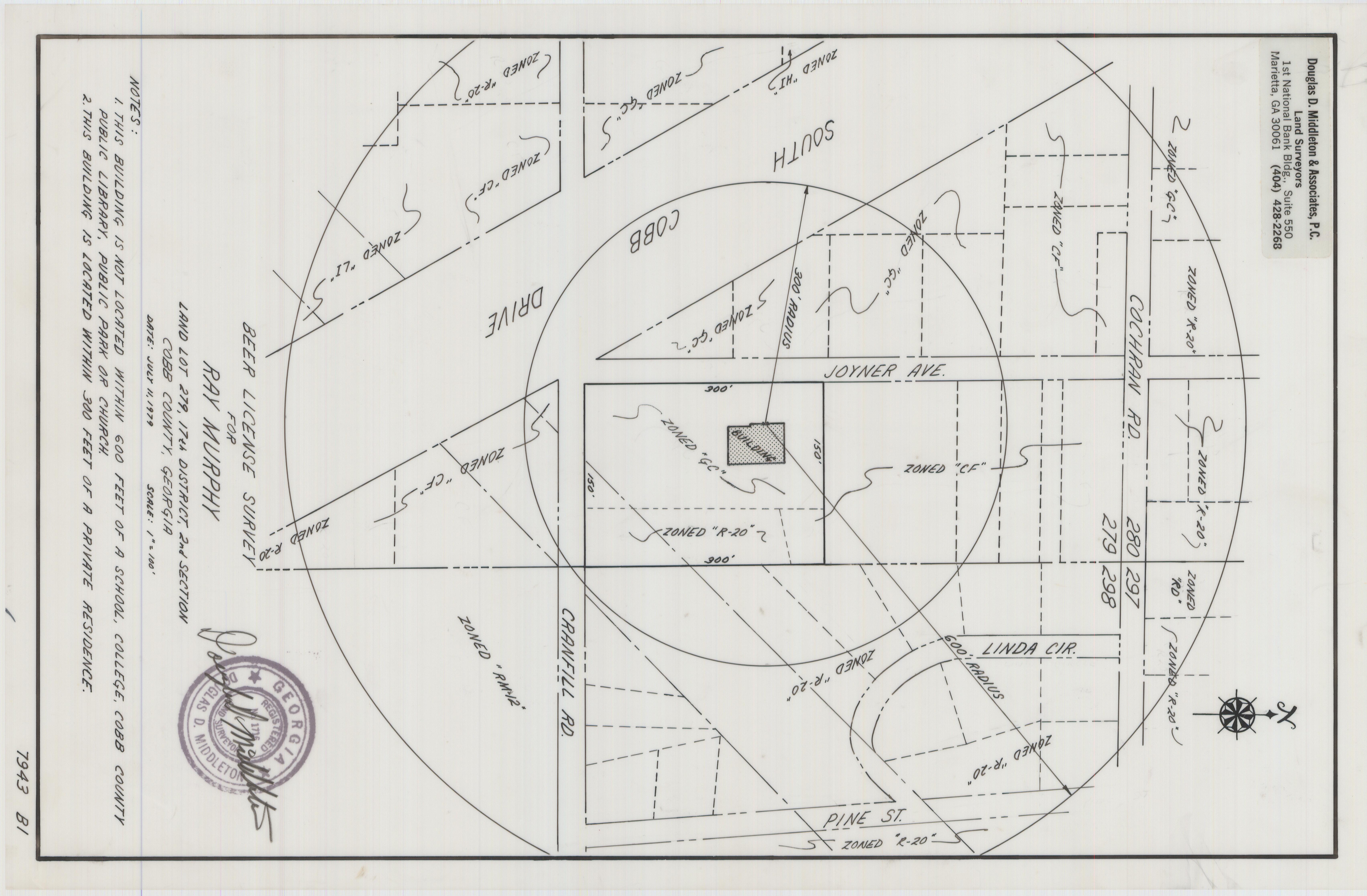 Beer License Survey for Ray Murphy, Joyner Avenue, 1979, Douglas D. Middleton survey maps, 1970-1992, SC/M/008, Kennesaw State University Archives.