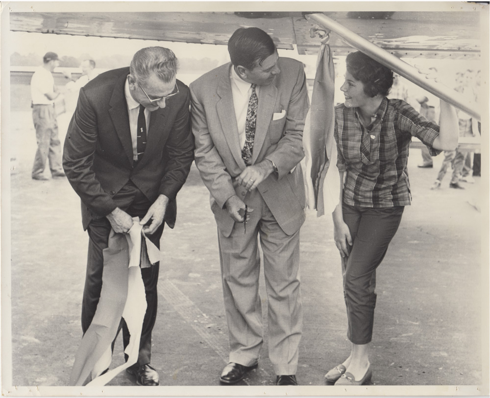 Cobb County, Georgia, Commissioner Herbert Clay McCollum, U.S. Senator (GA) Herman Eugene Talmadge, and Jeanette Ardell, "Miss Cobb County," "Miss Georgia," "Miss Dixie," take part in the ribbon cutting at the opening of McCollum Airport (Cobb County International Airport), September 4, 1960, September 4, 1960, Larry Brantley Thompson Collection, 2020, Kennesaw State University