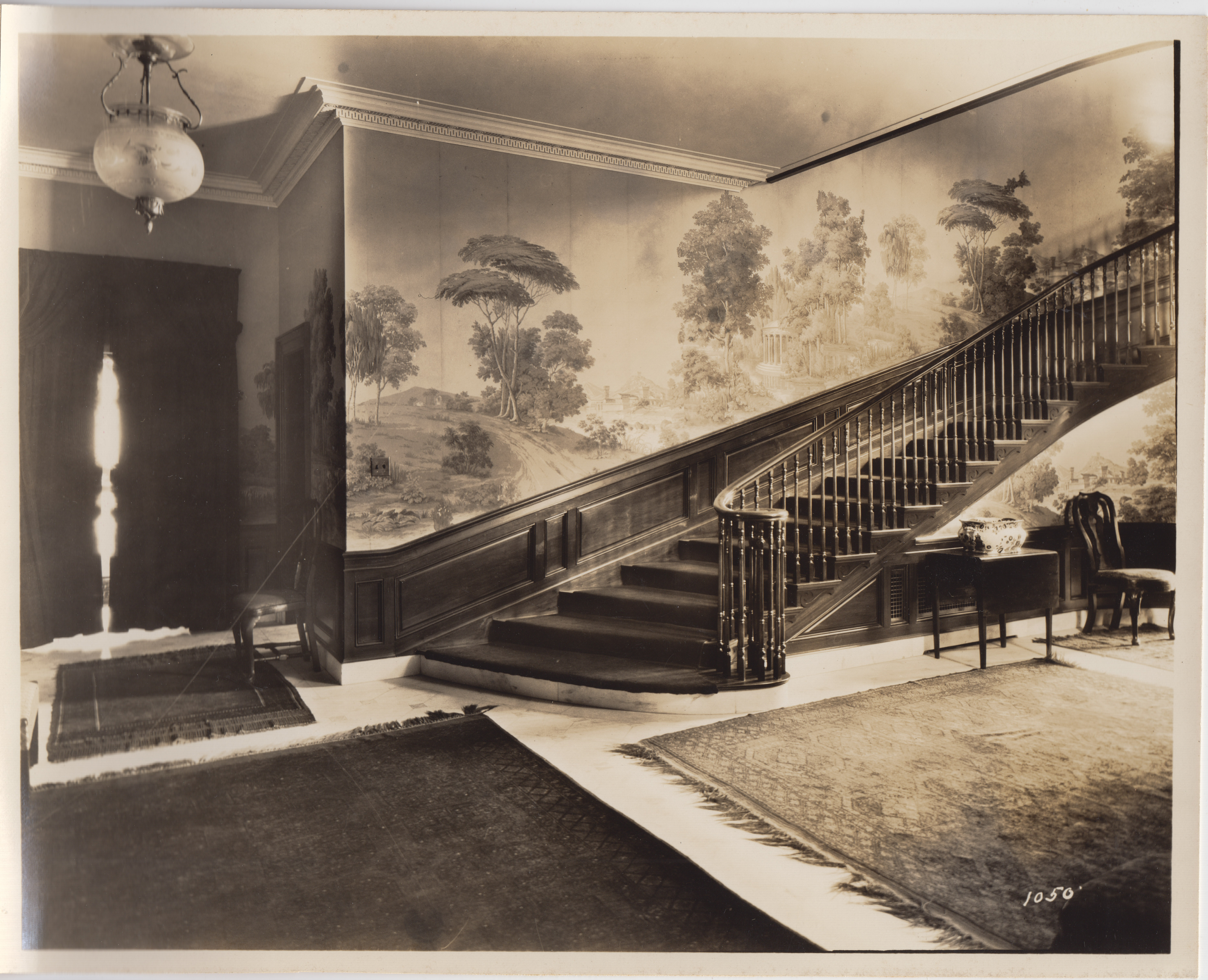 Sam Tate House or the "Pink House" (hall and staircase), completed in 1926 using Etowah pink marble quarried at the Georgia Marble Company south of the home, Tate, Georgia, ca. 1920s