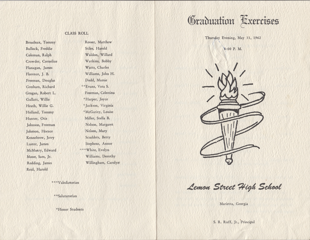 Lemon Street High School graduation exercises program, 1962-05-31, The Lemon Street Schools Oral History Collection, Marietta City Schools, 2020, KSU/14/05/04, Kennesaw State University.