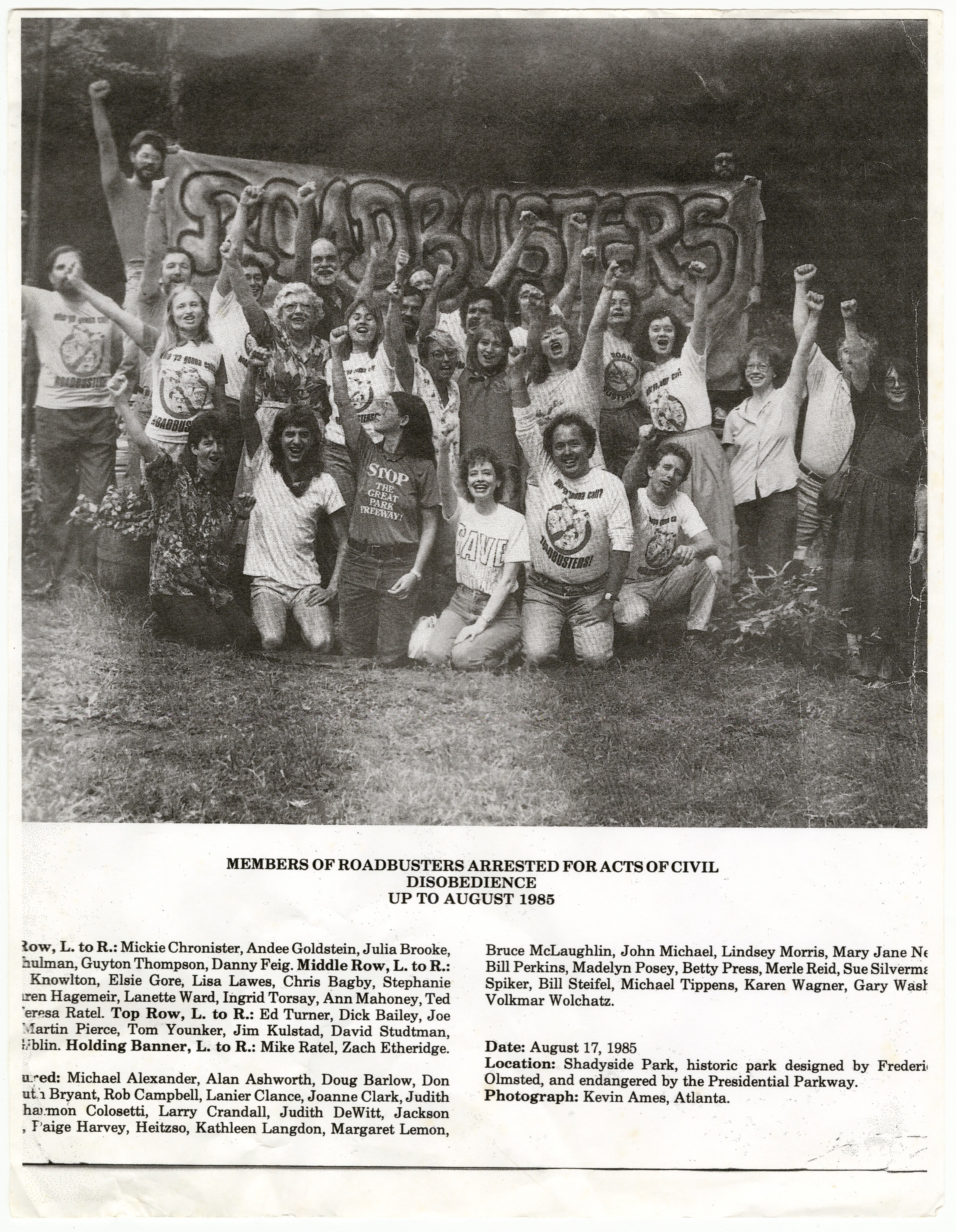 Members of Roadbusters Arrested for Acts of Civil Disobedience Up to August 1985, 1905-06-07, CAUTION Inc. (Atlanta Road Fight) Collection, 1971-2021 SC/R/002, Department of Museums, Archives, and Rare Books, Kennesaw State University