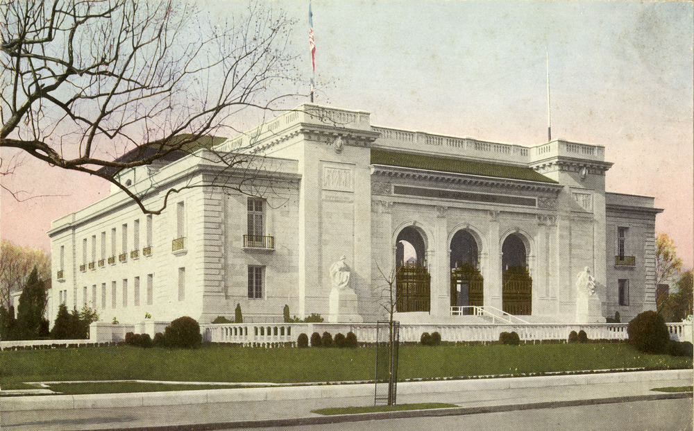 Photograph of the Pan American Union Building, Washington, D.C. Reverse reads: "Pan American Building, Washington, D.C. Executed in White Georgia Marble, From Quarries, Tate, Georgia. Chicago Office: 456 Monadnock Building. Architects: Albert Kelsey and Paul P. Cret, Associate Architects."
