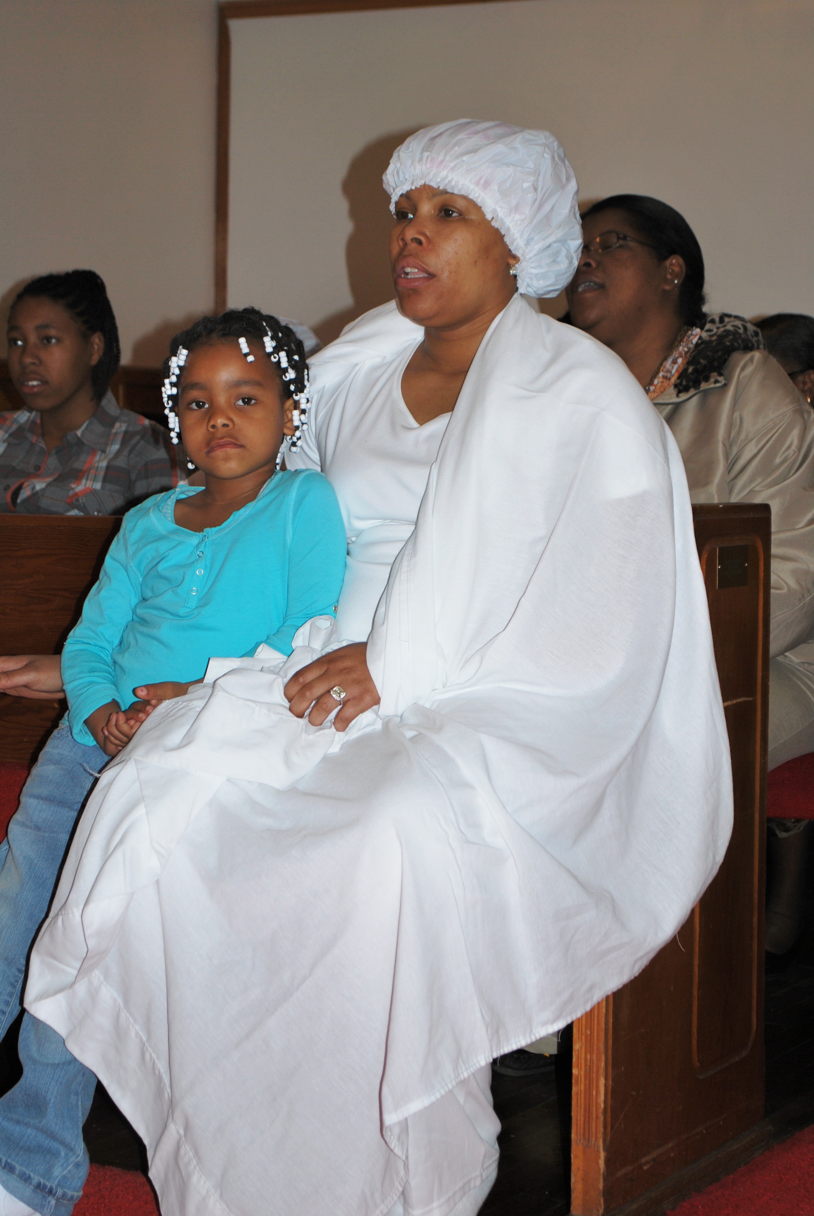 Angie Davis (seated, center) and unidentified people, baptism ceremony, Mt. Calvary Baptist Church, Tate, Georgia, May 2010