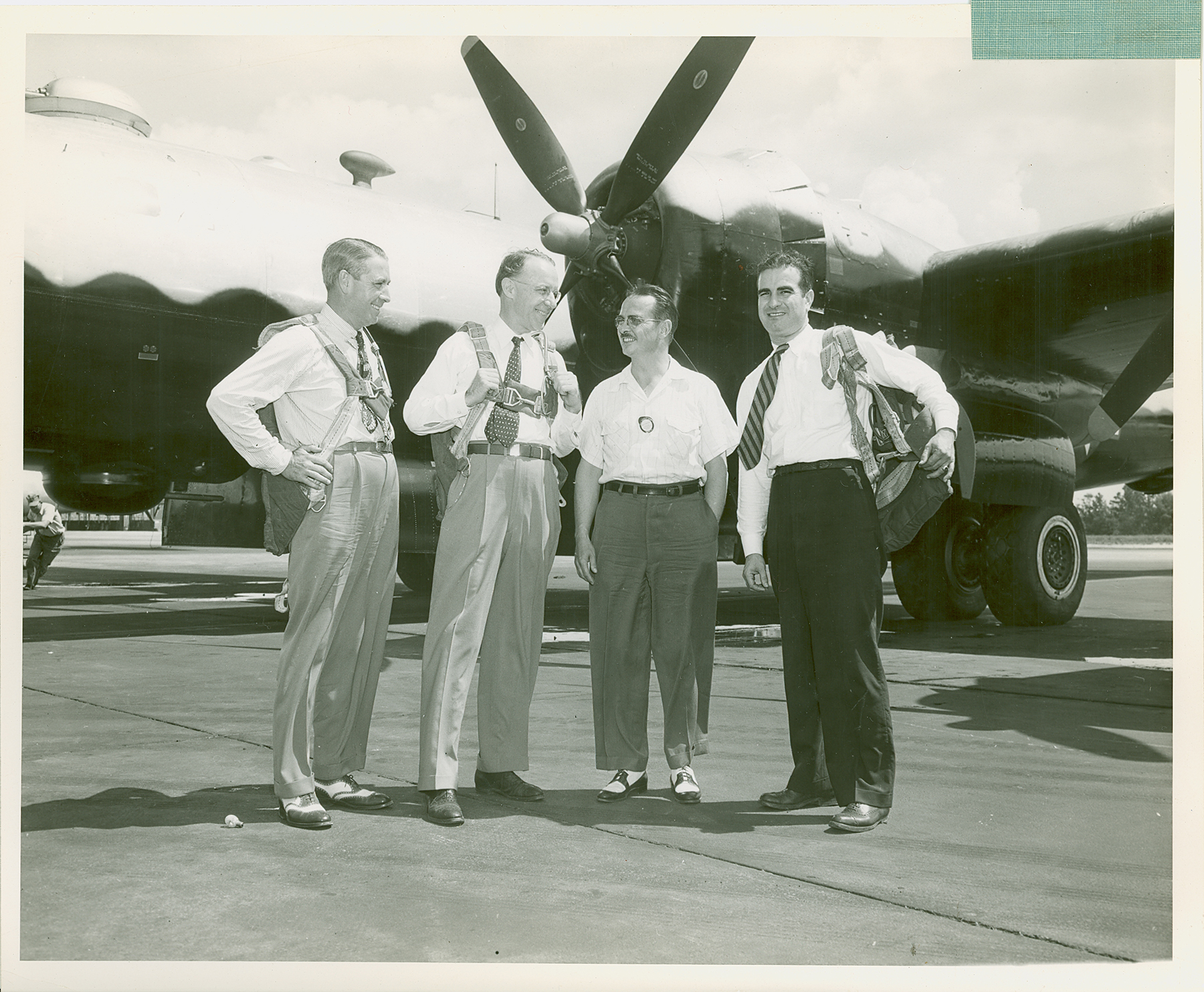From left: John A. Chiles, William B. Hartsfield, E.R. Hawkings, and Jimmy Winn pose in front of B-29 bomber wearing pararchutes