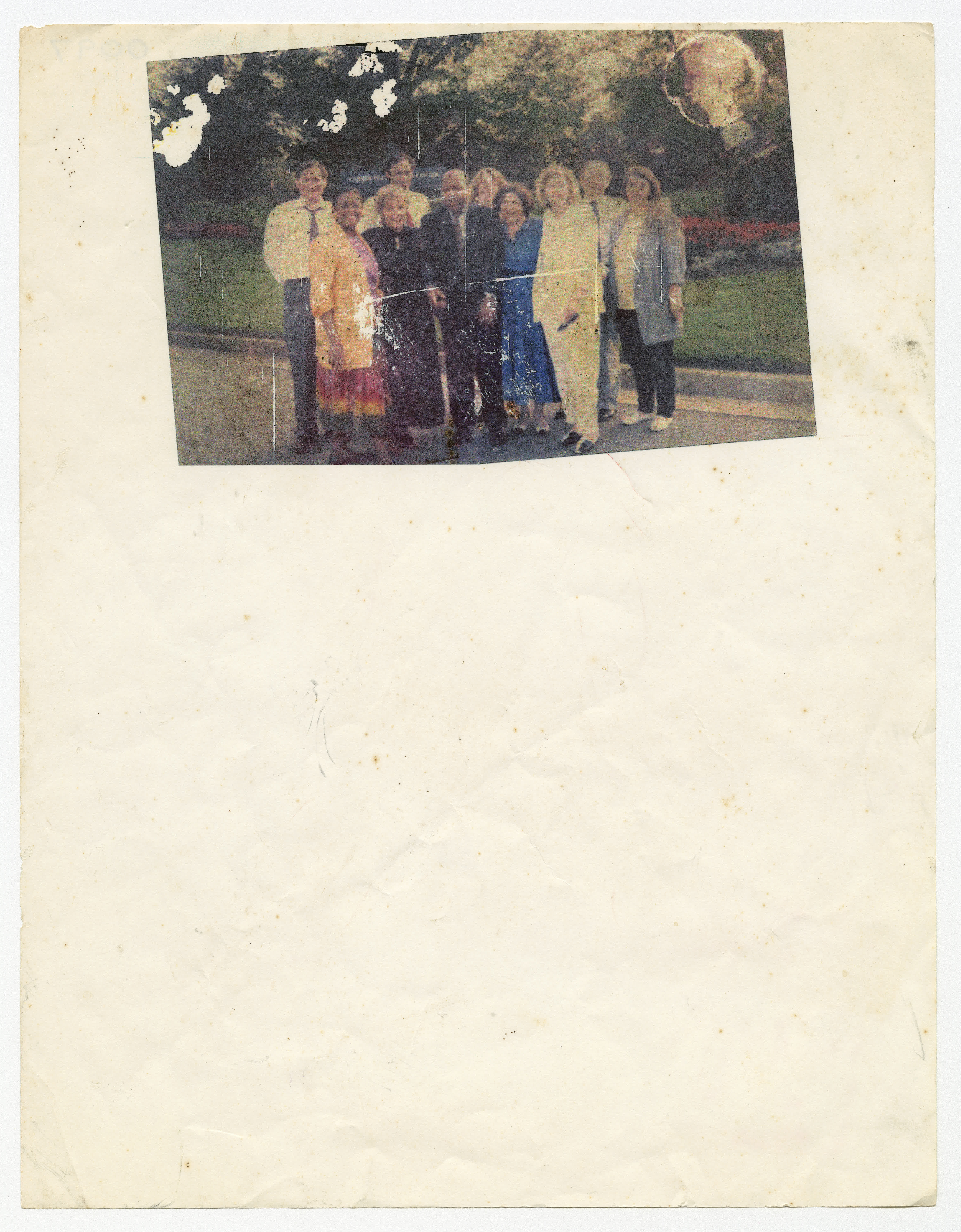 This scan of badly deteriorated photo shows (left to right) Rob Remar (attorney), Richard Ossoff, Cathy Bradshaw, Leon Eplam, Sheila Brown, Nina Gentry and John Lewis.