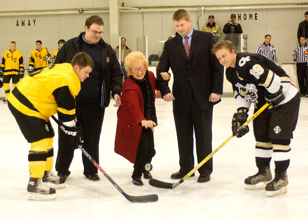 Betty L. Siegel drops the puck at a KSU vs. Georgia Tech hockey game, December 2, 2005