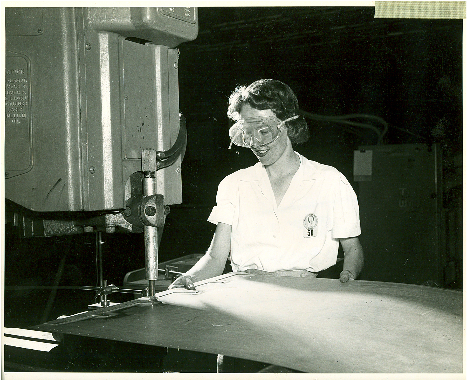 Mary Withrow, spot welder, working with machinery