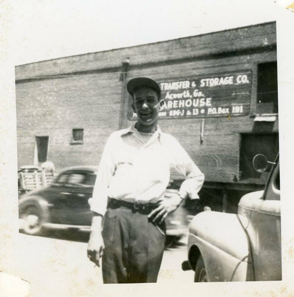 Tommy Jones in front of old cotton warehouse, Acworth, Georgia, circa 1947