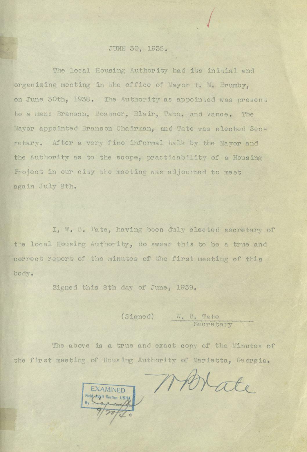 First meeting minutes by the Marietta Housing Authority in the office of Mayor T. M. Brumby, on June 30, 1938.