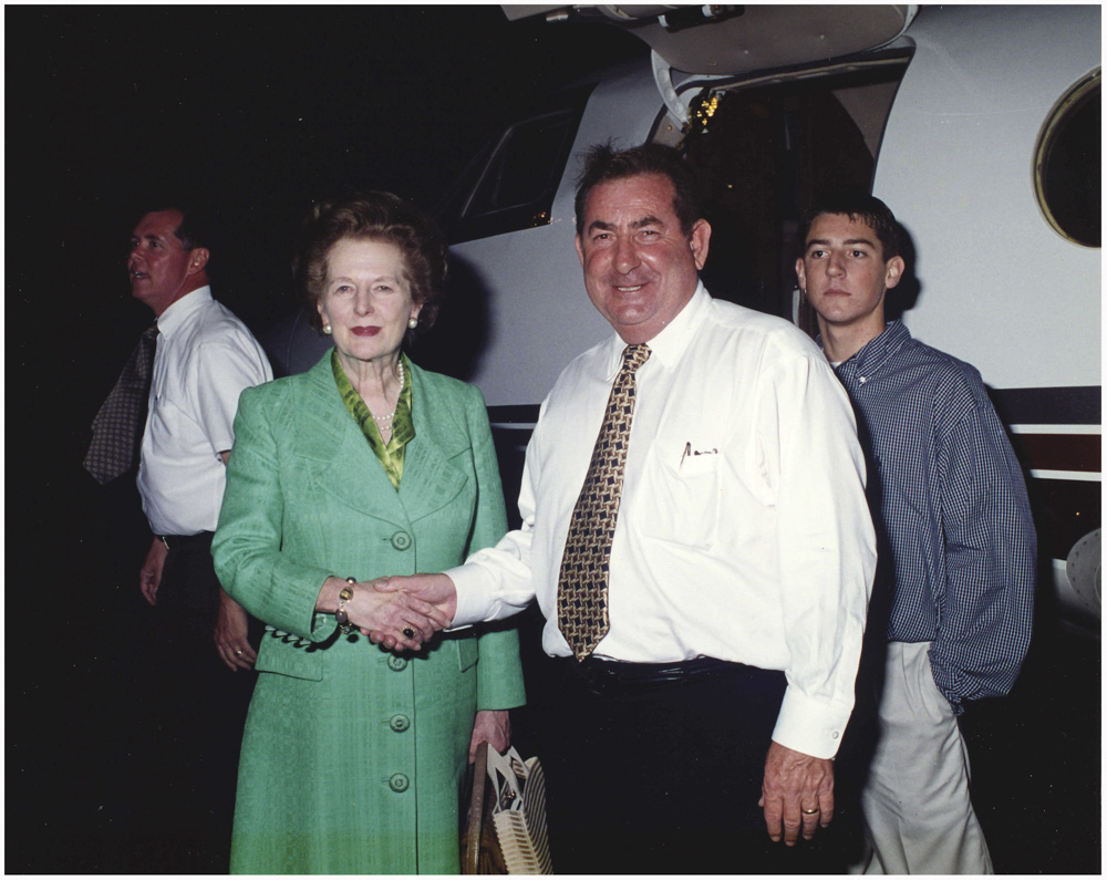 UK Prime Minister Margaret Thatcher and pilot and real estate developer Larry Brantley Thompson, after Thompson flew Thatcher from Dallas, Texas, to Cobb County, Georgia, where she delivered a speech to the Cobb County Prayer Breakfast, McCollum Airport (Cobb County International Airport), 1999.