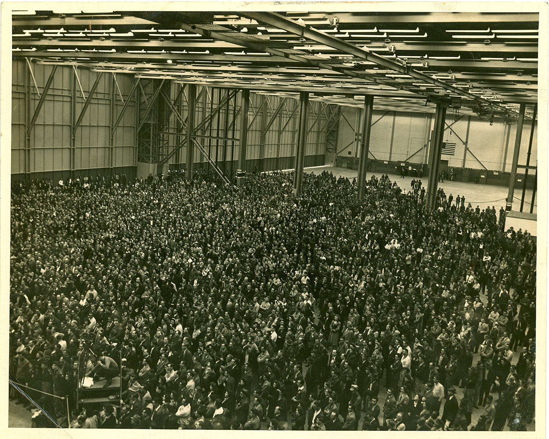 Birds-eye view of large crowd gathered in a Bell Bomber plant building.