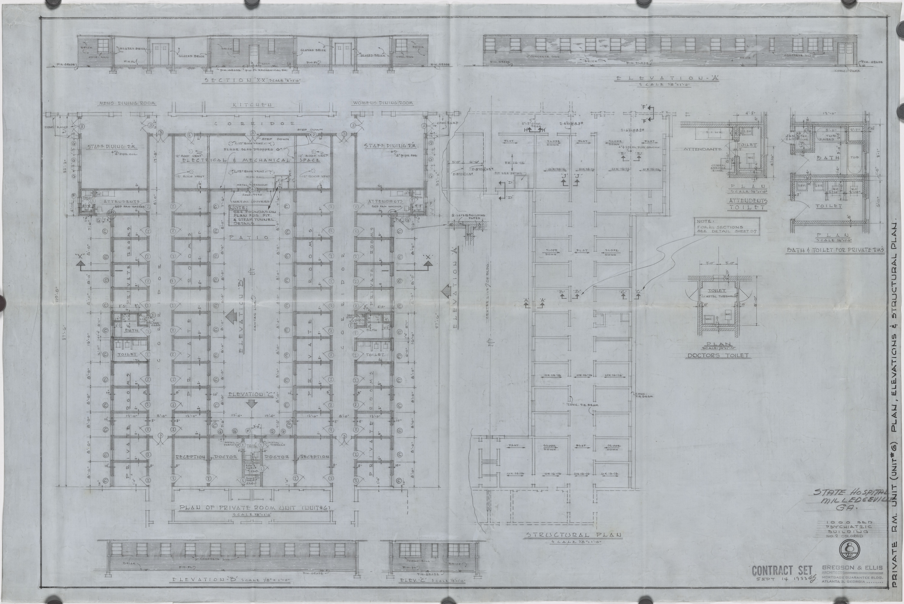 Second Colored Psychiatric Building, Milledgeville. Private unit plan - elevations and structural plan