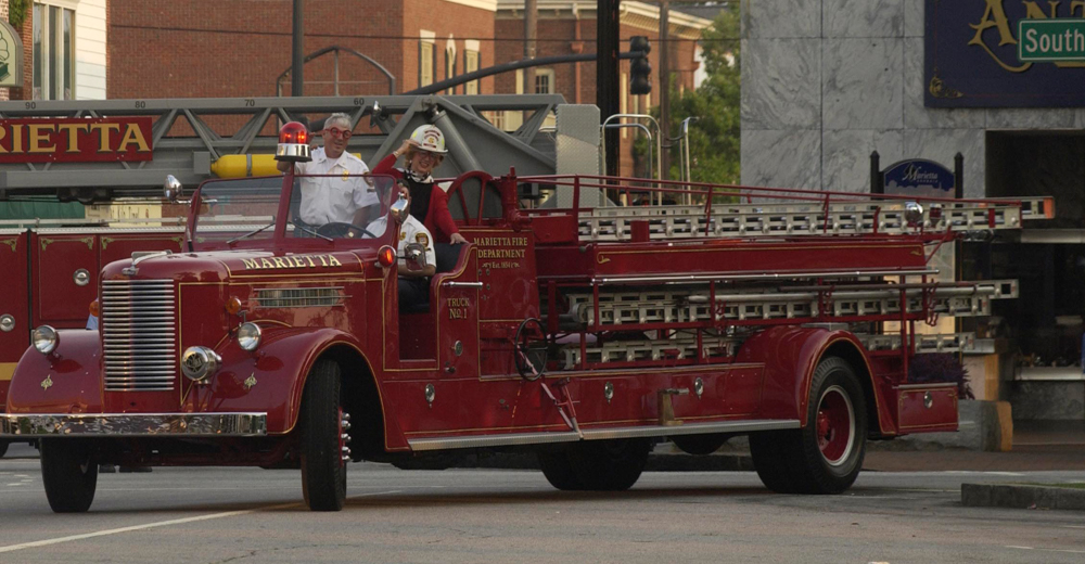Betty L. Siegel riding in a firetruck, 2004, Betty L. Siegel. photographs and images, 1973-2017, KSU/03/03/016, Kennesaw State University Archives.