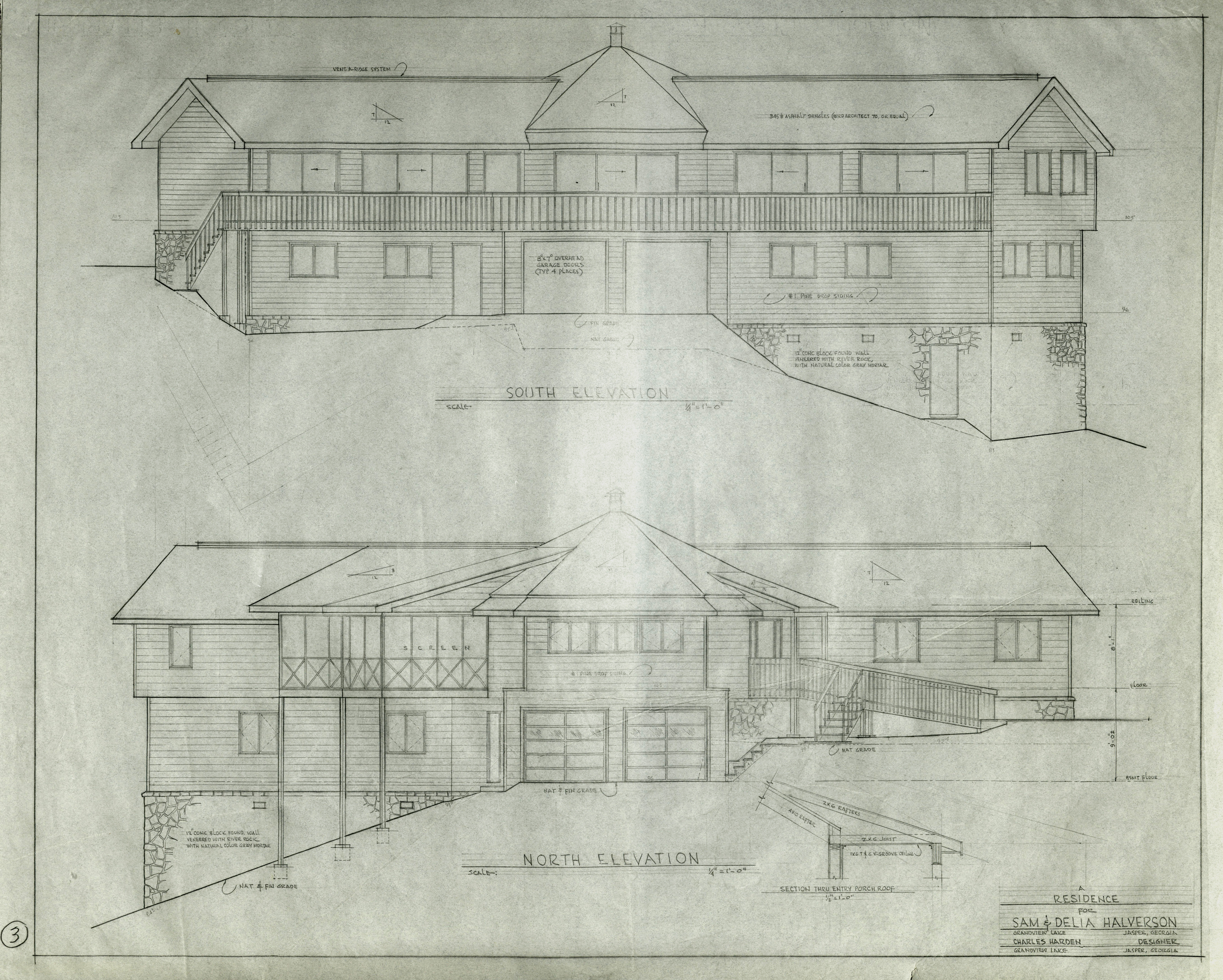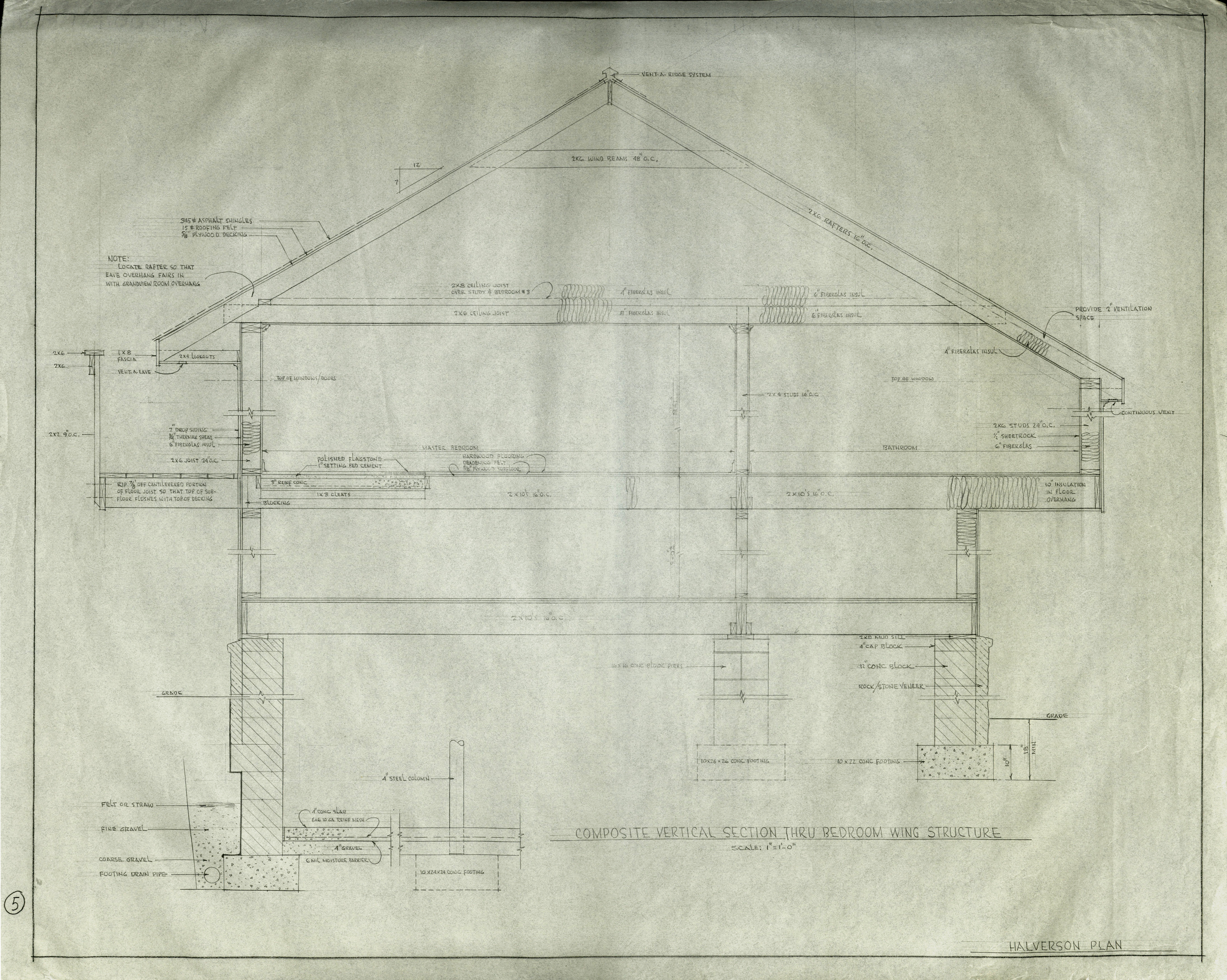 Collection of blueprints for the Sam and Delia Halverson residence in Jasper, Georgia, drafted by Charles Harden. Includes basement, foundation, and floor plans, grandview room roof framing plan, elevation diagrams, and various cross-section and detail drawings.