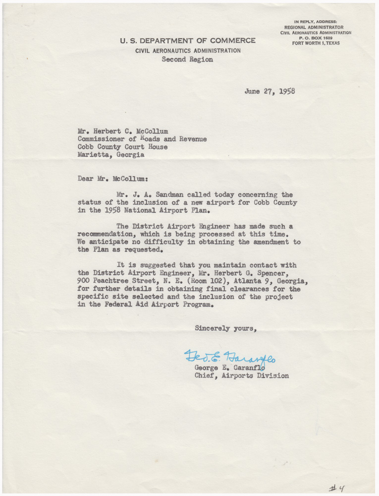 Letter to Cobb County, Georgia, Commissioner Herbert Clay McCollum from Civil Aeronautics Administration Airports Division Chief George E. Garanflo, June 27, 1958