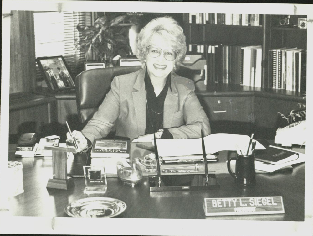 Portrait of Betty L. Siegel at her desk, circa 1980s.