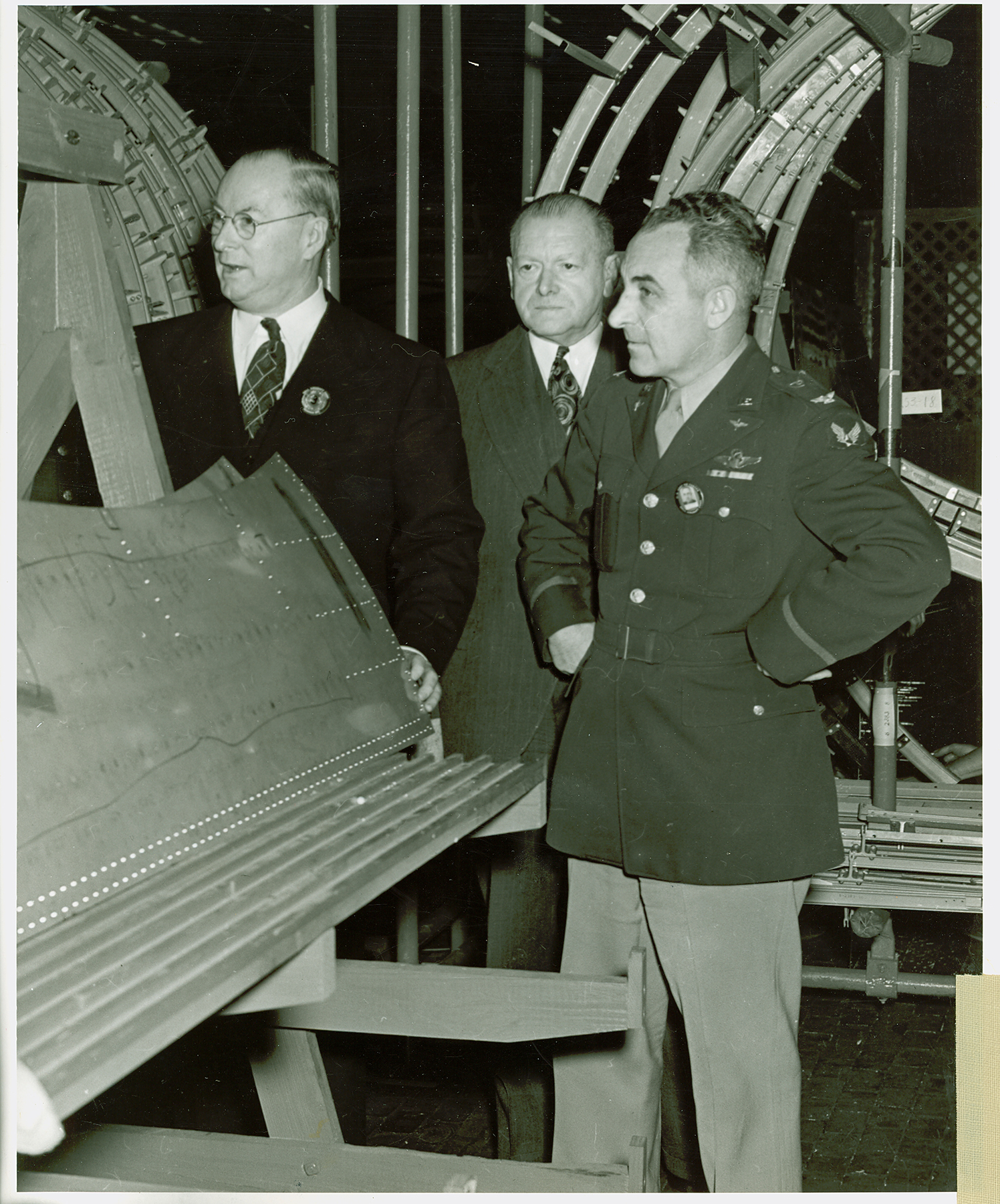 Donald Nelson, chairman of the War Production Board, inspects the Bell Bomber plant with Colonel O'Connor and an unidentfied male