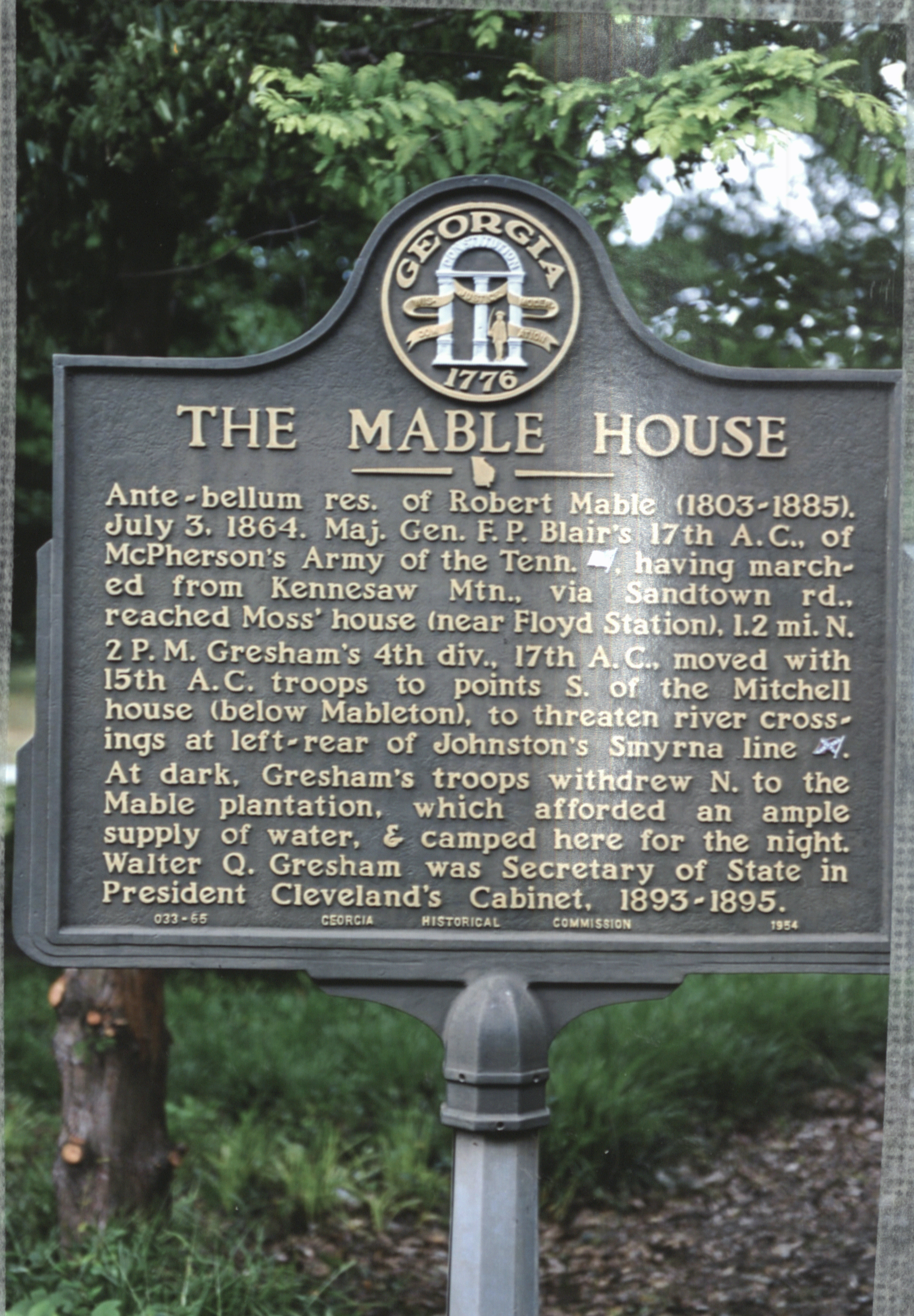 Historical marker for the Mable House erected in 1954 by the Georgia Historical Commission. The marker documents the use of the Mable House as a resting place for Union soldiers (Gresham's 4th division, Army of the Tennessee) during the Civil War.