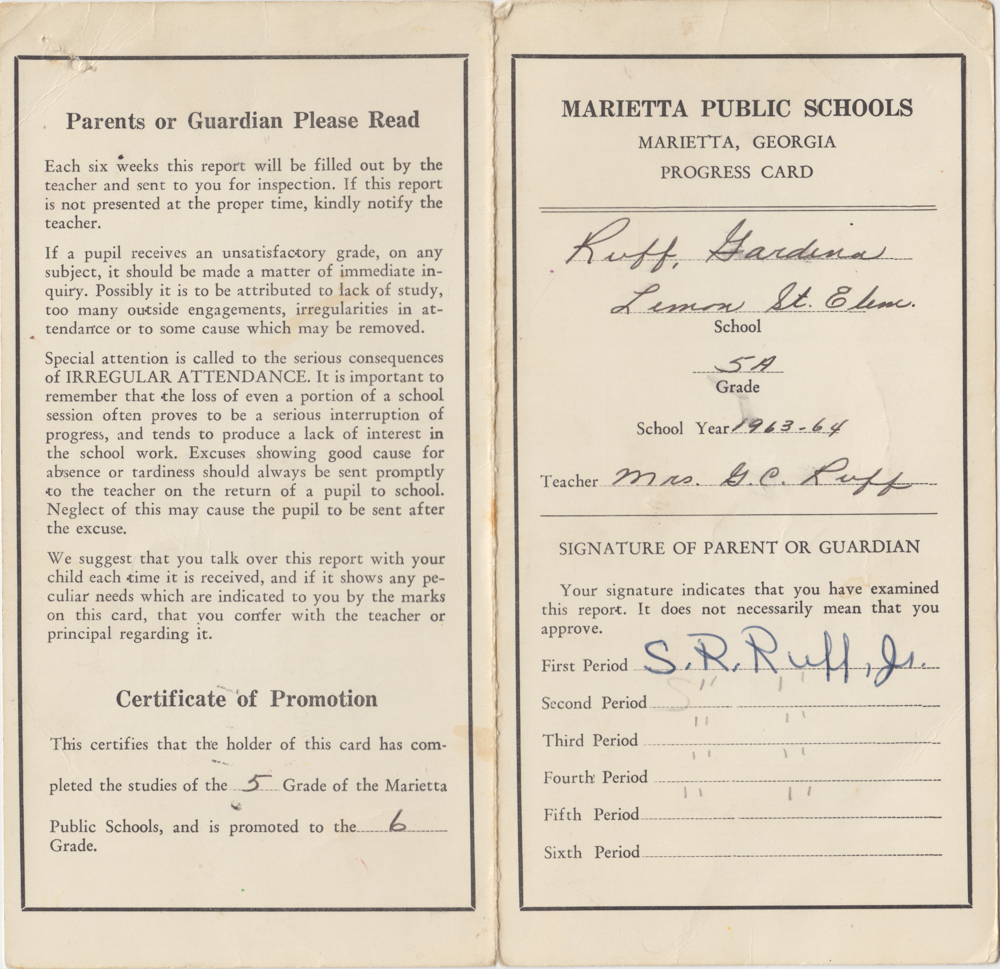 Gardina Ruff’s progress card, Lemon Street Elementary School, 1963-1964, The Lemon Street Schools Oral History Collection, Marietta City Schools, 2020, KSU/14/05/04, Kennesaw State University.