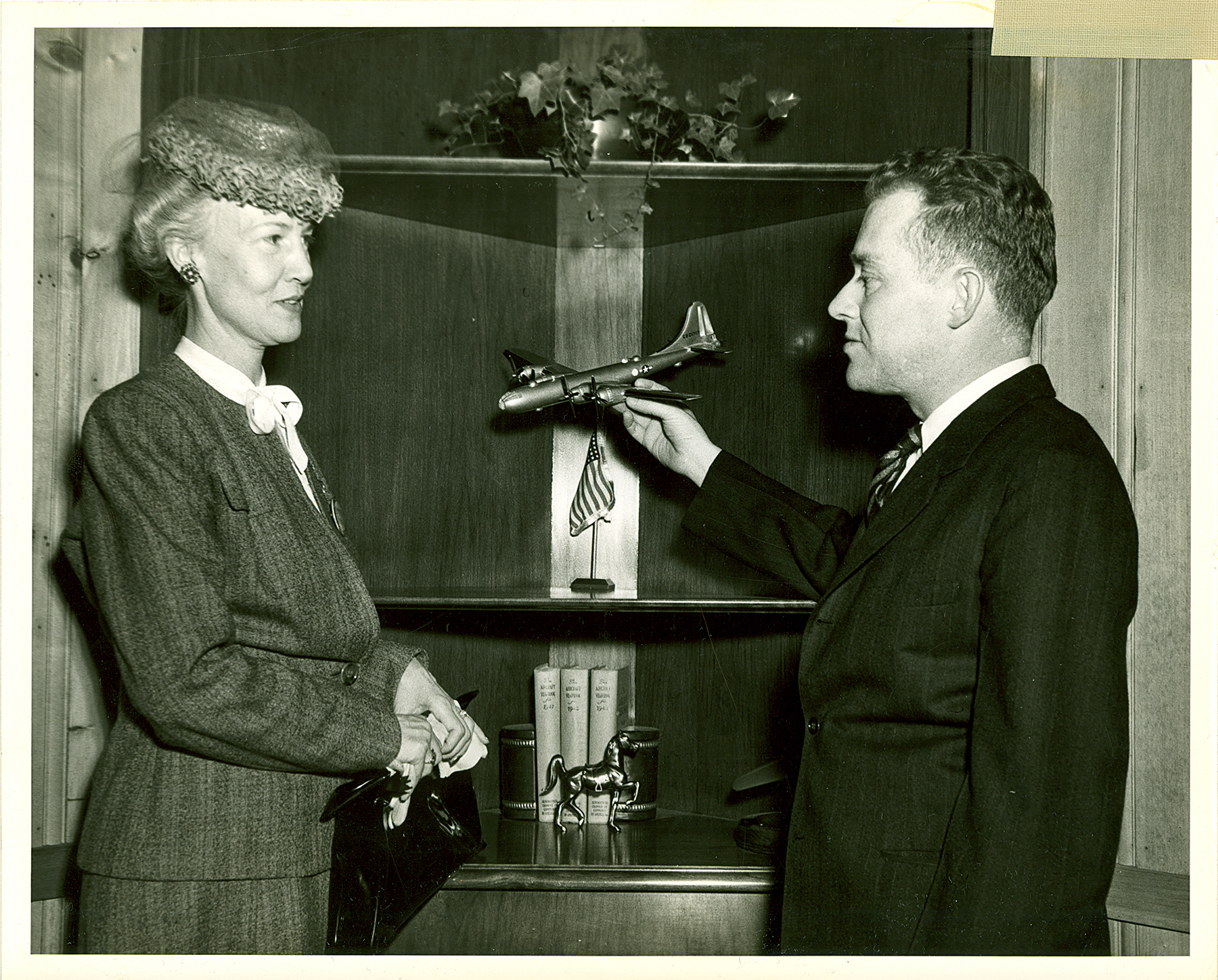Mrs. Hodges, wife of General Courtney Hodges, speaks with James Carmichael, plant general manager