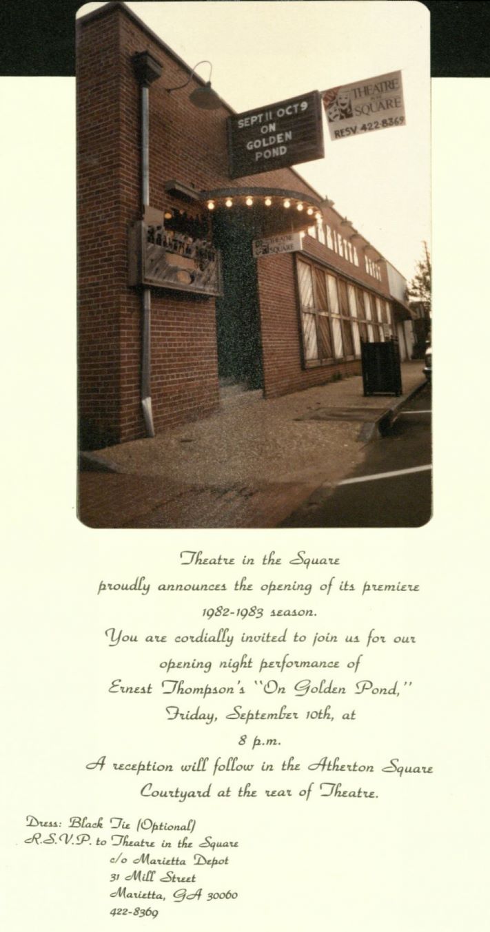 Invitation and image of the opening night performance of the first theatrical production by Theatre in the Square, On Golden Pond, held on September 10, 1982, at the theater's first location in the Marietta Depot at 31 Mill St.