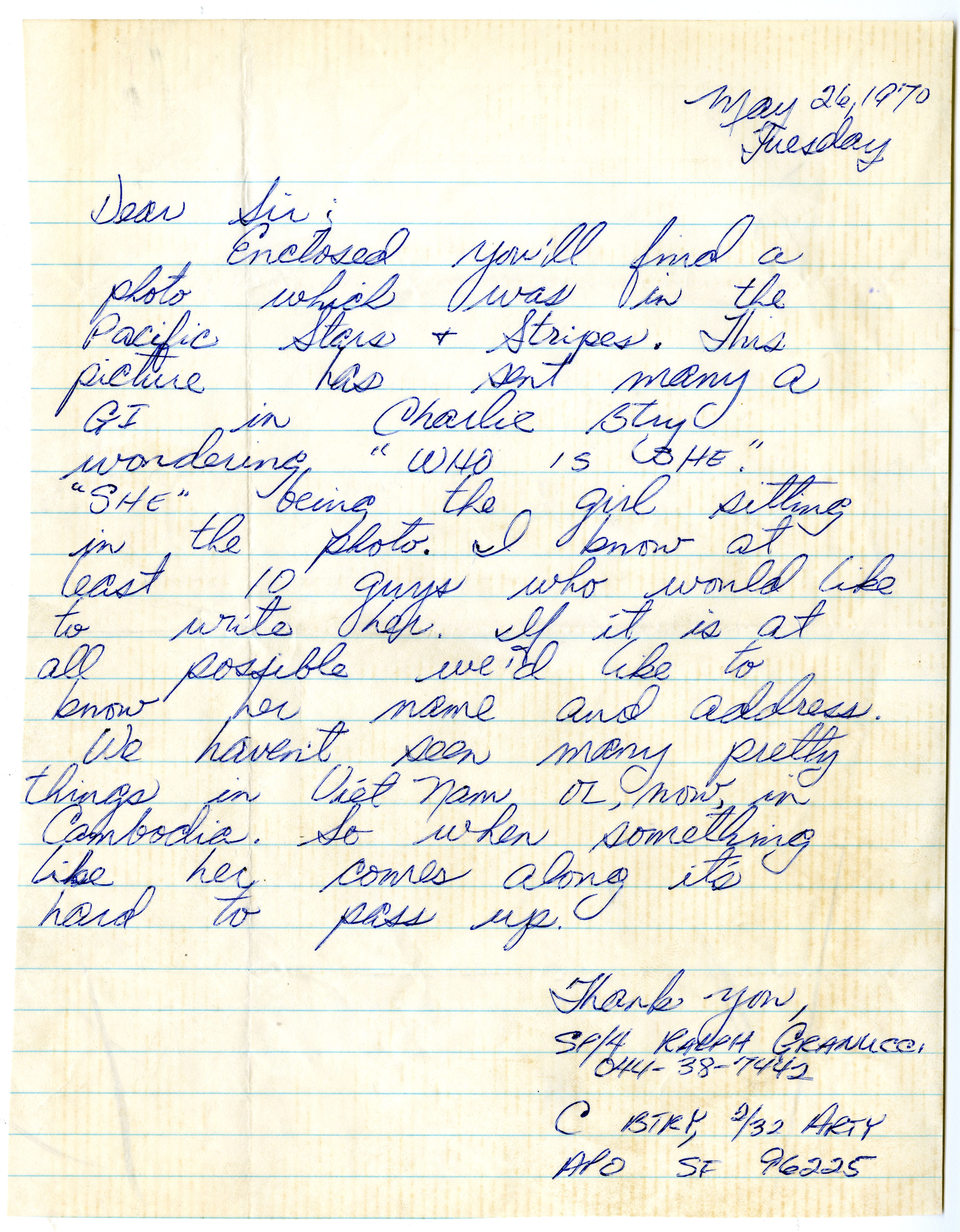 Letter received by Kennesaw Junior College from Ralph Granucci regarding Stella Merritt's photograph in the Pacific Stars and Stripes (newspaper of the U.S. Armed Forces).