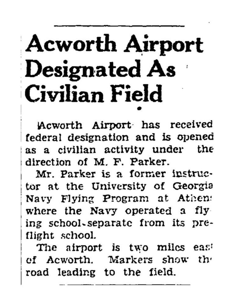 "Acworth Airport Designated as Civilian Field" article