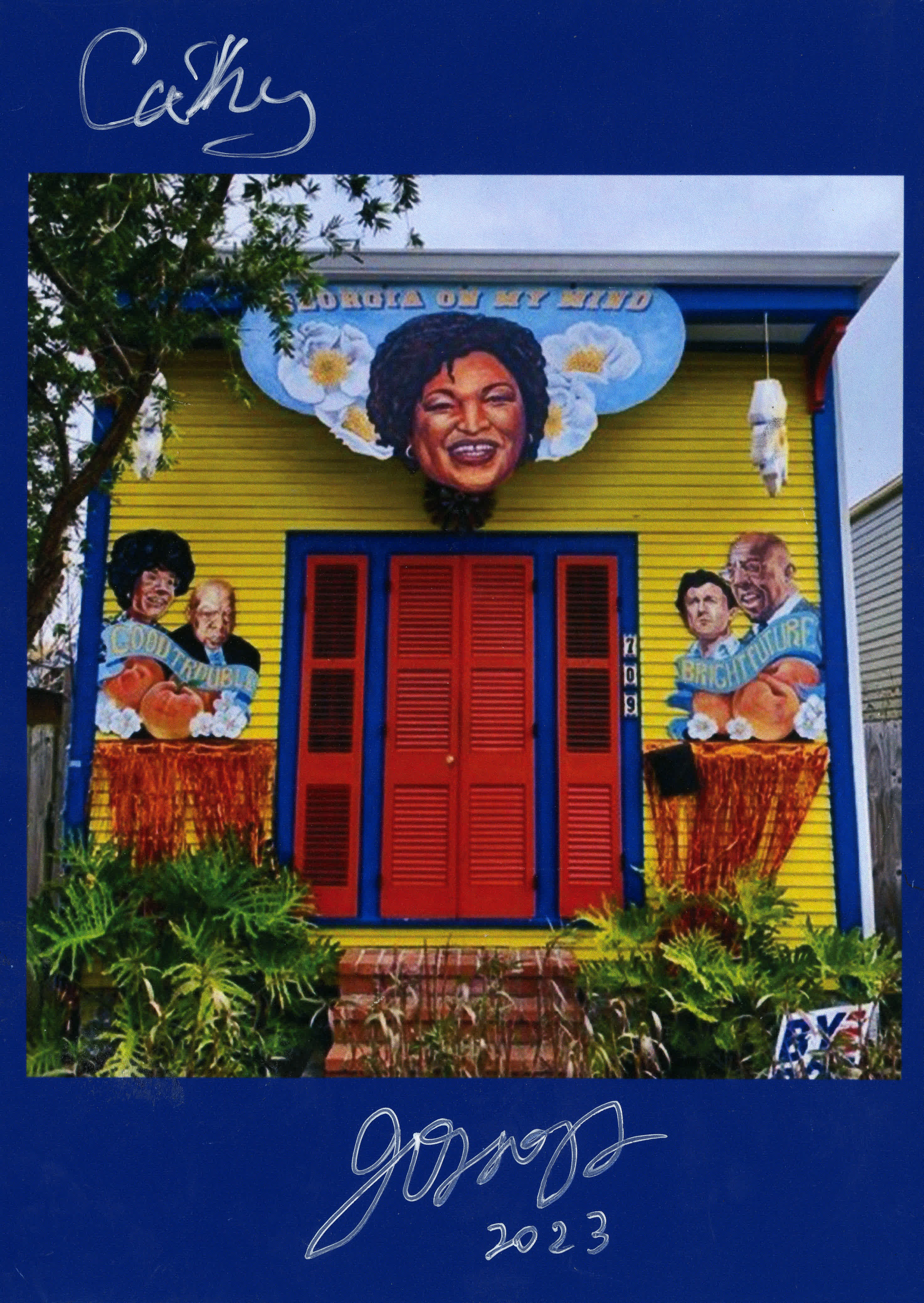 Photograph of a house with artwork showing Stacey Abrams, John Lewis, Jon Ossoff, Raphael Warnock, and Shirley Chisholm. This New Orleans house was decorated for Mardi Gras. The photo is signed to Cathy Bradshow by Jon Ossoff.