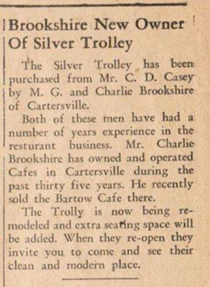 "Brookshire New Owner of Silver Trolley," Save Acworth History Foundation collection, SC/A/003, Kennesaw State University Archives.