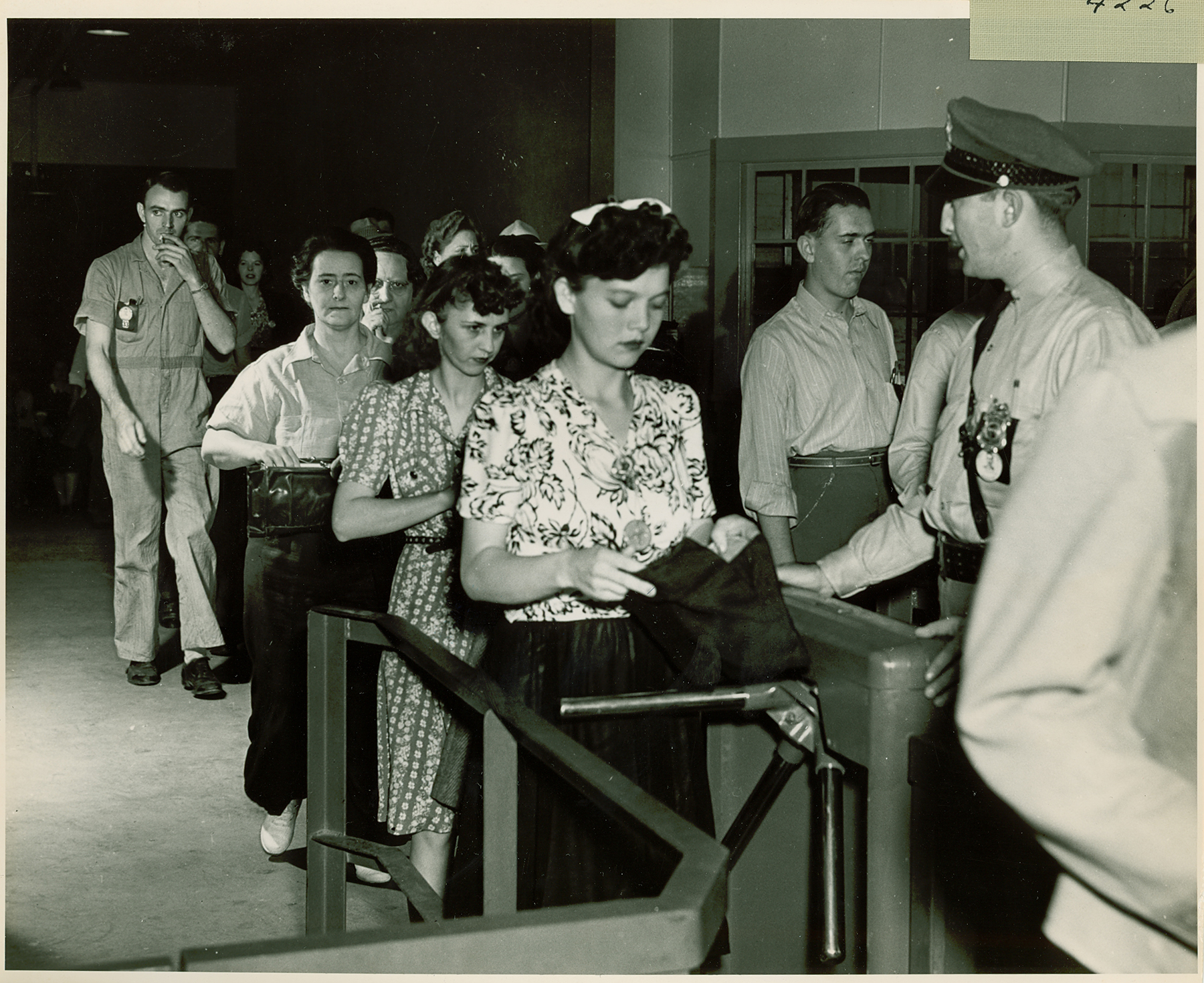 Female employees in line to pass through security after their shift ends