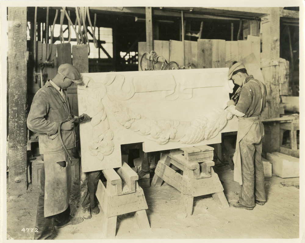 Photograph of workers hand carving marble with pneumatic tools at Georgia Marble finishing mill.