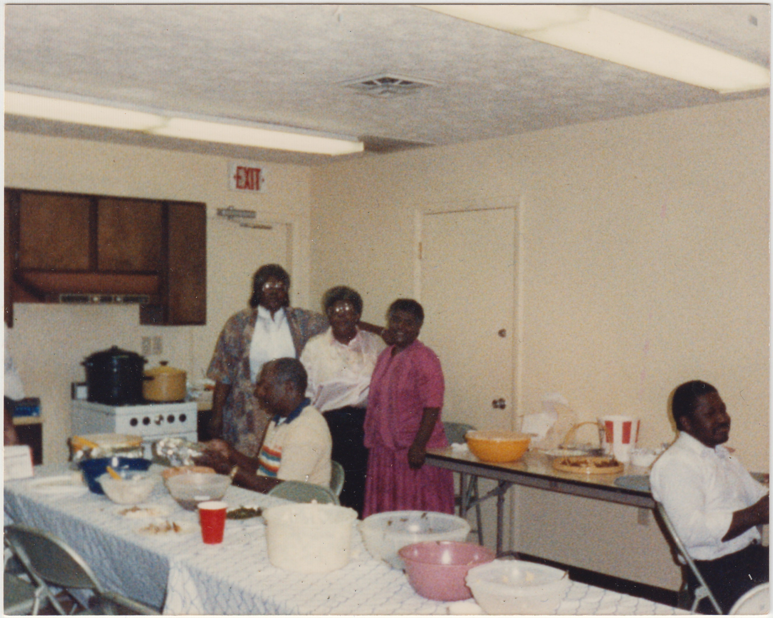 Dorothy Hampton Preston, Annie Ruth Hampton Moody, Lois Hampton Cherry, unidentified, Rev. Douglas Hampton, Hampton Reunion, Mt. Calvary Apartments Community Center, ca. 1980s