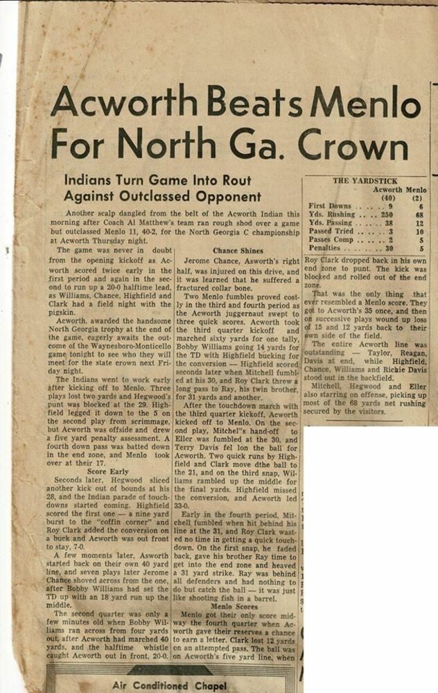 "Acworth Beats Menlo for North Georgia Crown," newspaper article, Save Acworth History Foundation collection, SC/A/003, Kennesaw State University Archives.