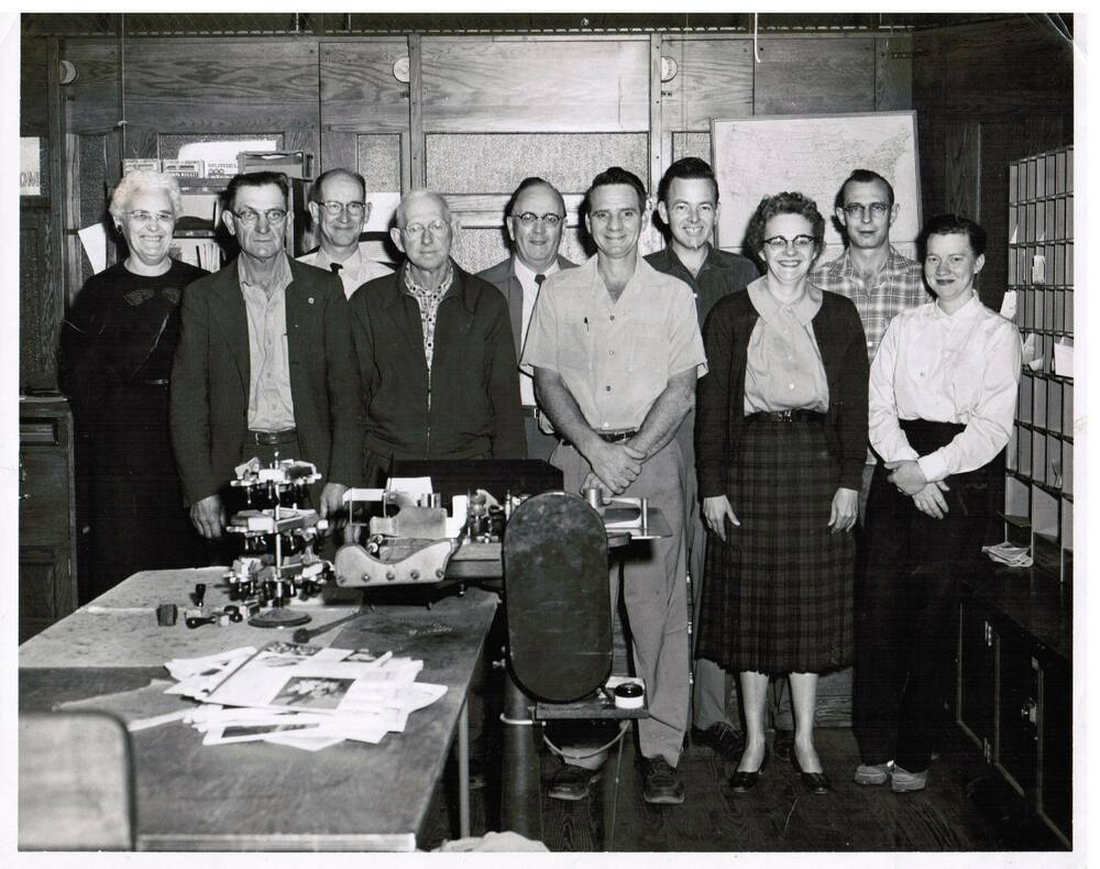 Pictured, right to left: Nancy Maxwell, George Hadaway, Margaret Mcclure, Roy Tippens Jr., Lemon "Red" Smith, Mr. Mote, Mr. Ridings, Fred Abbot, Harvey Durham, and Ruth Mcclure, Post Master.