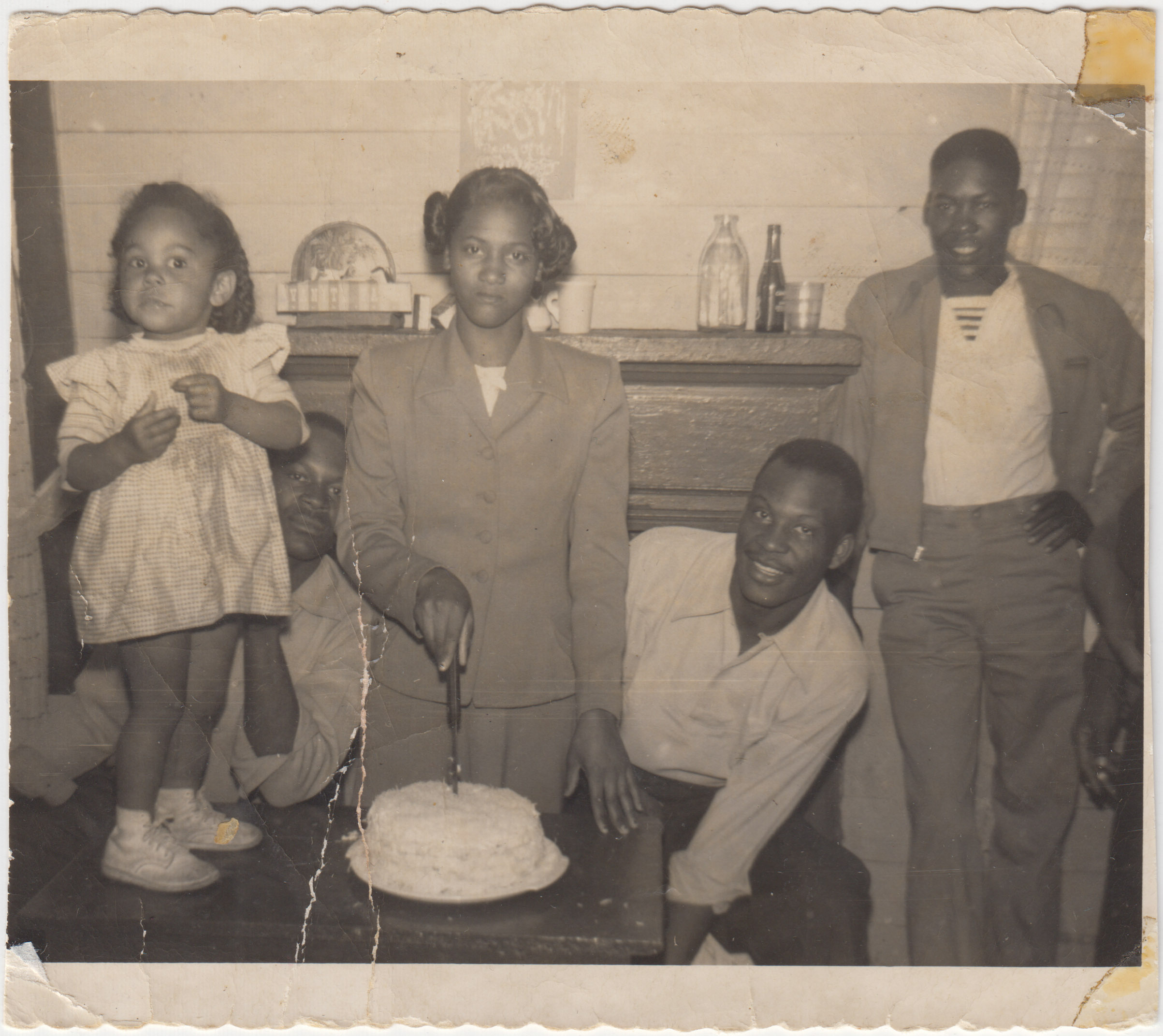 Gwen Rice Johnson, Walter Lee Johnson, Florence Rice Bates, Charlie Johnson, Jr., and Ervin Frederick, at Bates' 18th birthday, Moon Street, Acworth, Georgia, 1950, Historic Black Acworth Image Collection, 2020, Patton, Kennesaw State University