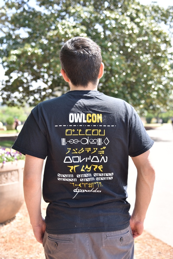 Front of shirt features KSU mountain logo and illustration of owl wearing glasses over the words "OwlCon." Back of shirt features the words "OwlCon" written in ten alphabets.