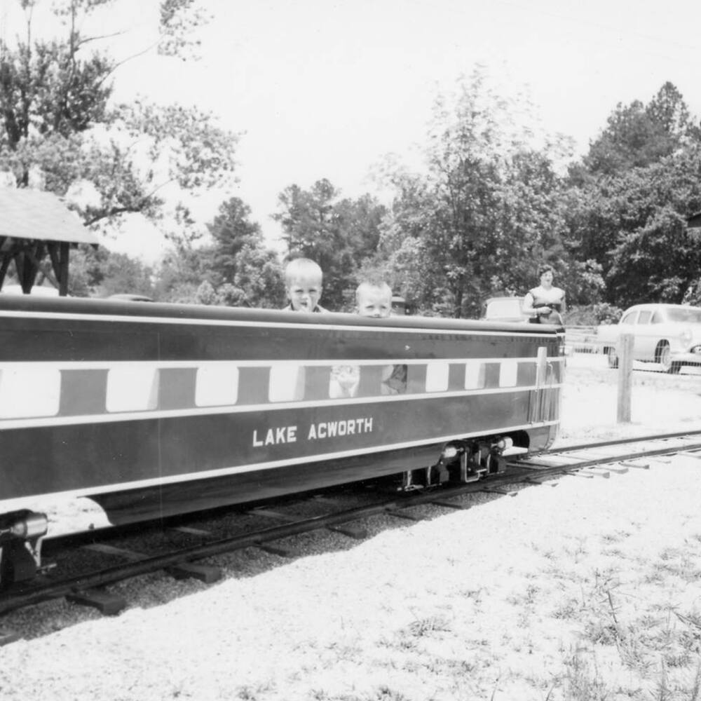 Rick and Bob Kienel, Jr. at Lake Acworth Beach train, Save Acworth History Foundation collection, SC/A/003, Kennesaw State University Archives.