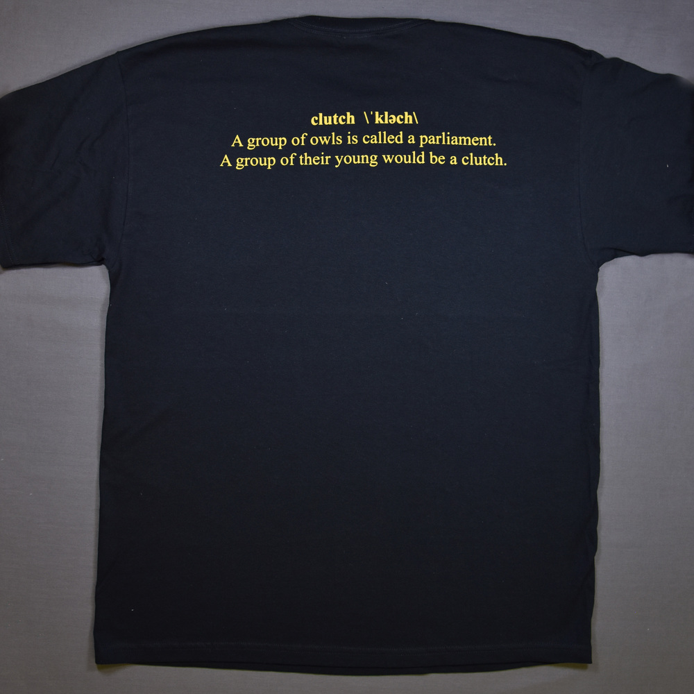 Clutch Council t-shirt. Front of shirt says "Clutch Council/Kennesaw State University." Back of shirt says "clutch \'klech\, A group of owls is called a parliament. A group of their young would be a clutch."