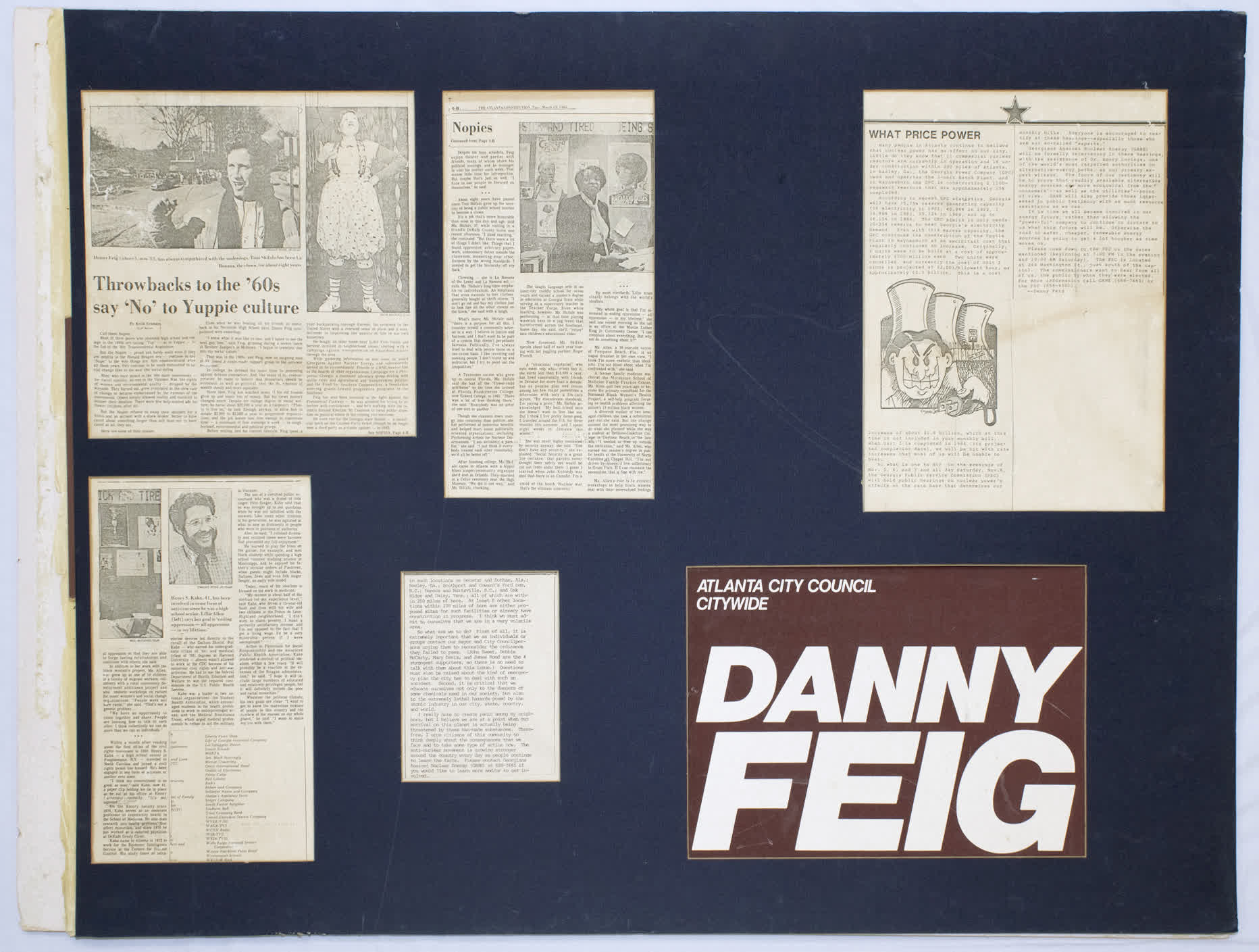 Poster, wtih newspaper clippings about the road fight and a campaign sign for council candidate Danny Feig