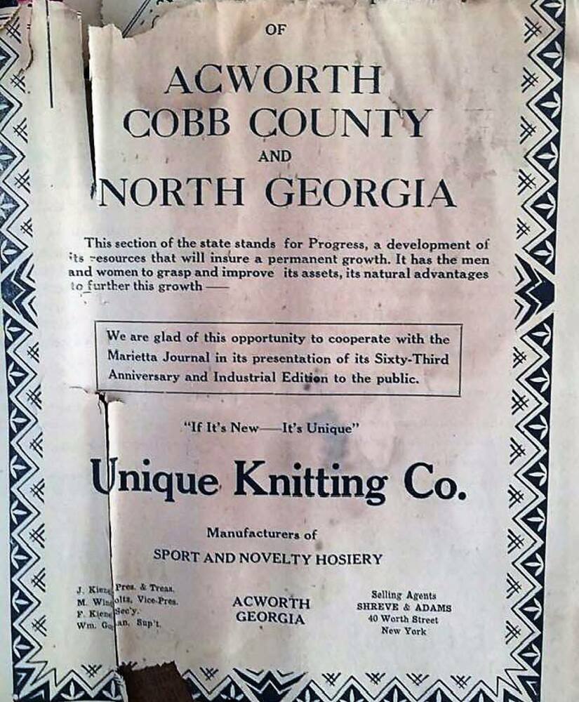 Unique Knitting Company advertisement, Save Acworth History Foundation collection, SC/A/003, Kennesaw State University Archives.