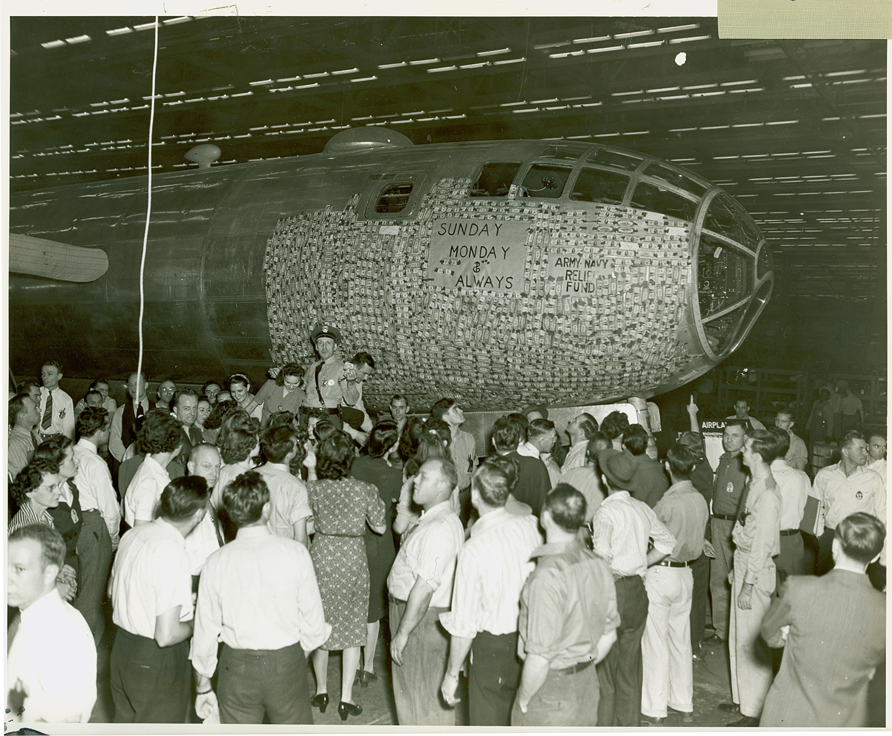 Employees crowd around B-29 bomber plastered with money for the Army-Navy Relief fund.
